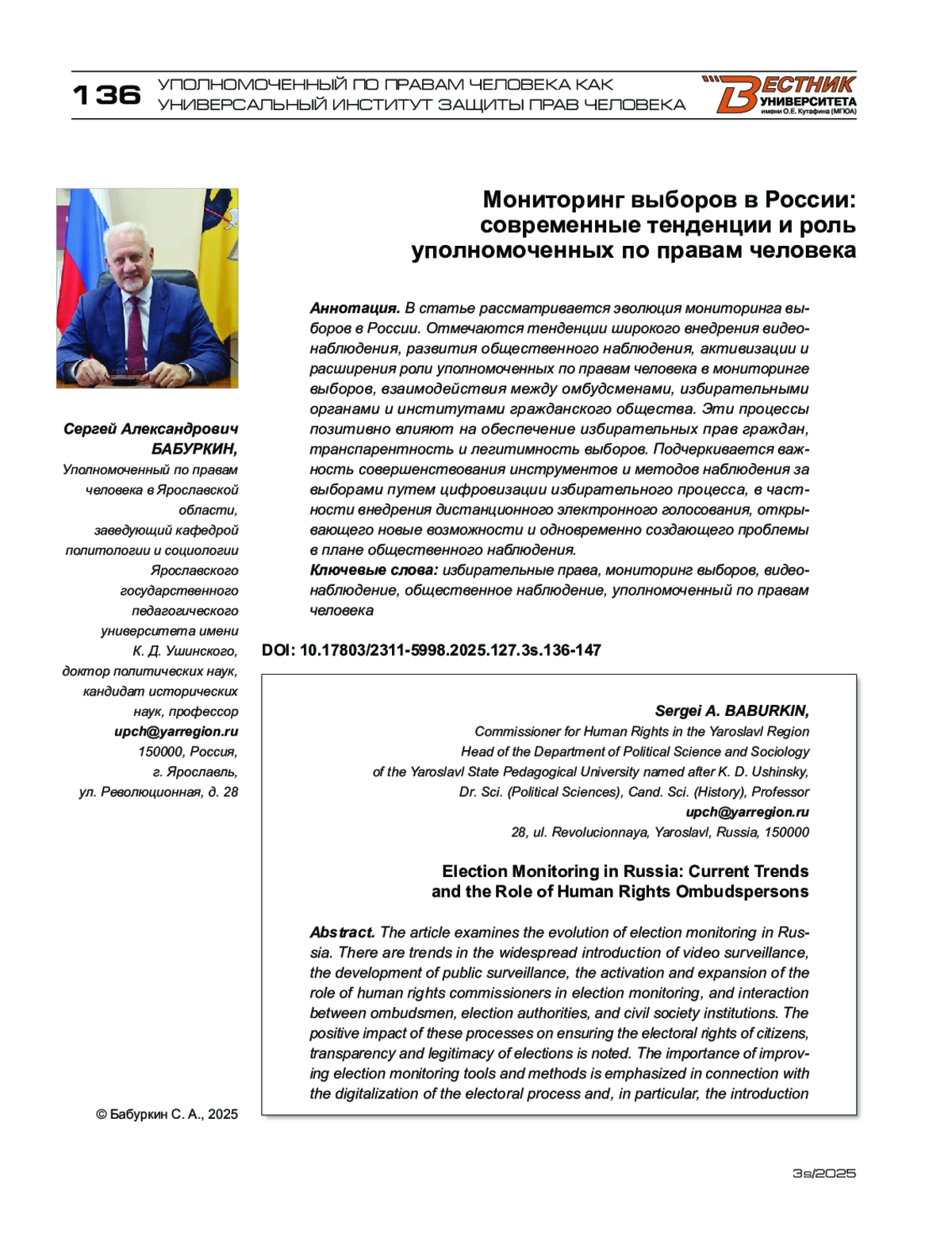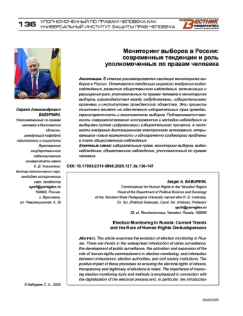 В статье рассматривается эволюция мониторинга выборов в России. Отмечаются тенденции широкого внедрения видеонаблюдения, развития общественного наблюдения, активизации и расширения роли уполномоченных по правам человека в мониторинге выборов, взаимодействия между омбудсменами, избирательными органами и институтами гражданского общества. Эти процессы позитивно влияют на обеспечение избирательных прав граждан, транспарентность и легитимность выборов. Подчеркивается важность совершенствования инструментов и методов наблюдения за выборами путем цифровизации избирательного процесса, в частности внедрения дистанционного электронного голосования, открывающего новые возможности и одновременно создающего проблемы в плане общественного наблюдения.