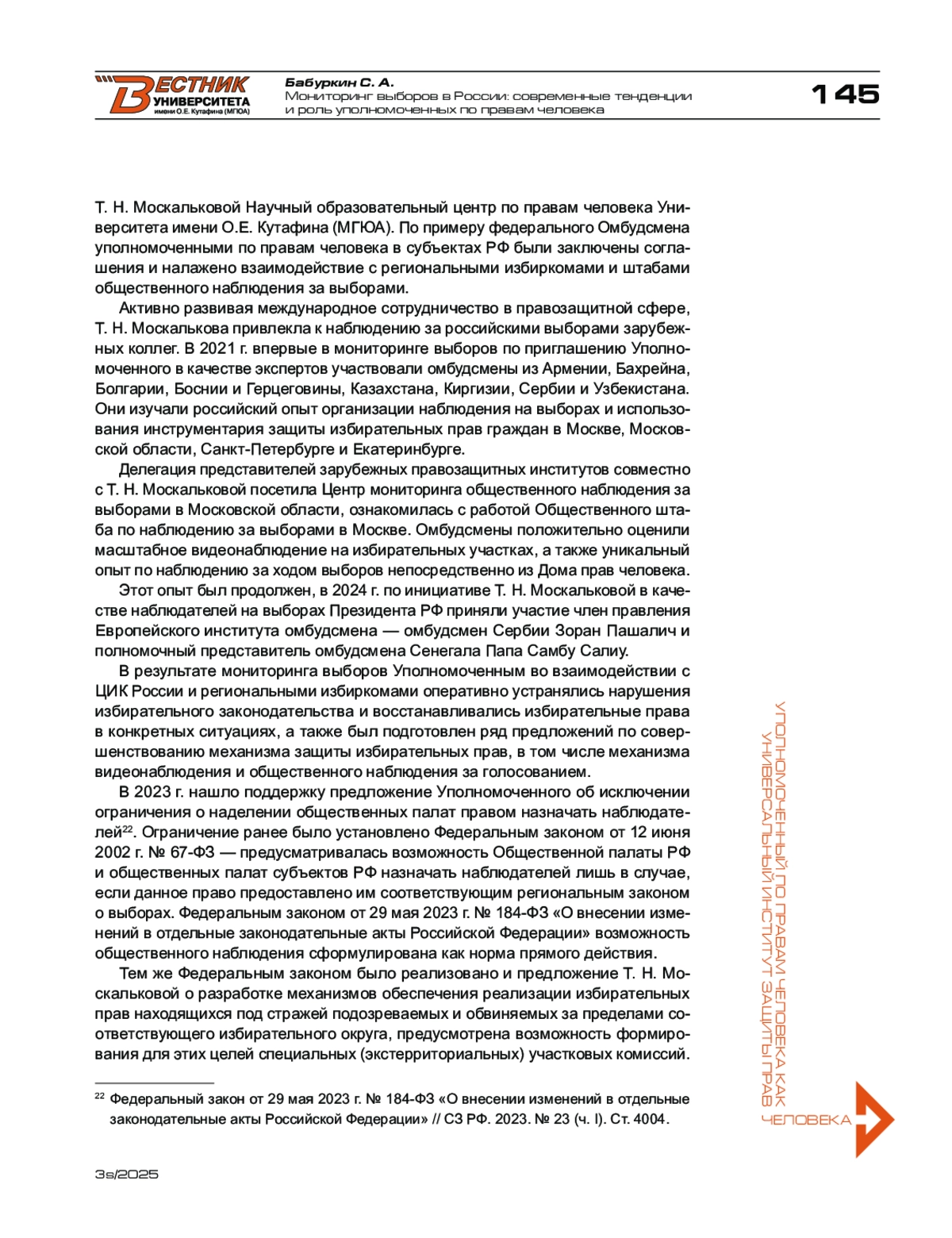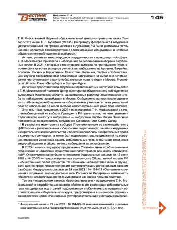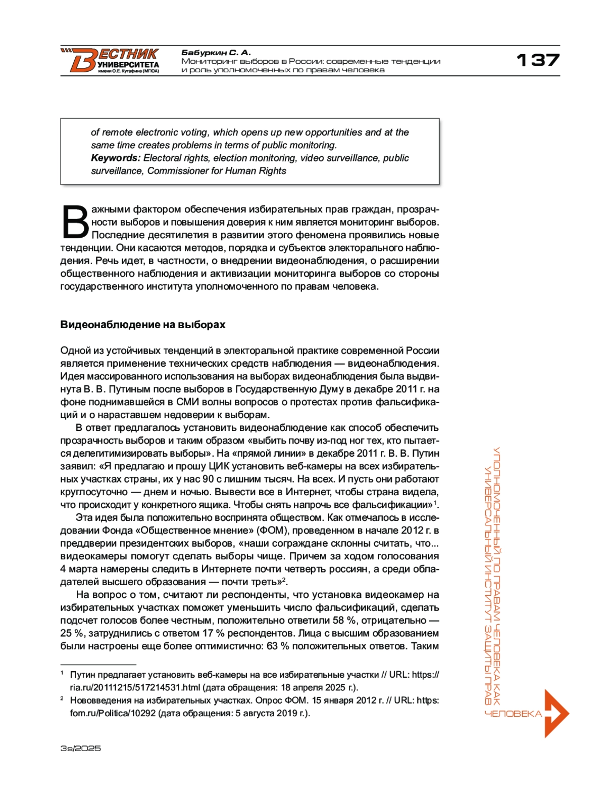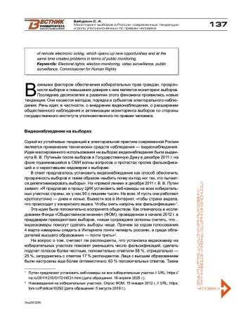 8. Ниточкин Ф. В. Общественное наблюдение за голосованием в механизме обеспечения избирательных прав граждан // Гражданин. Выборы. Власть. - № 2 (32) / 2024. - С. 62-75.