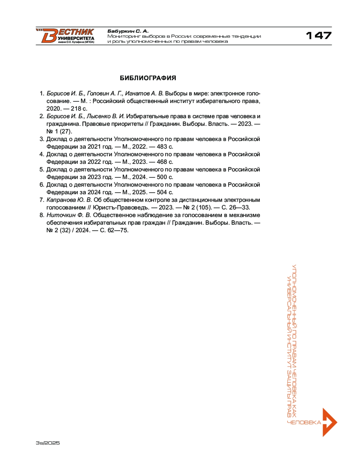 2. Борисов И. Б., Лысенко В. И. Избирательные права в системе прав человека и гражданина. Правовые приоритеты // Гражданин. Выборы. Власть. - 2023. - № 1 (27).