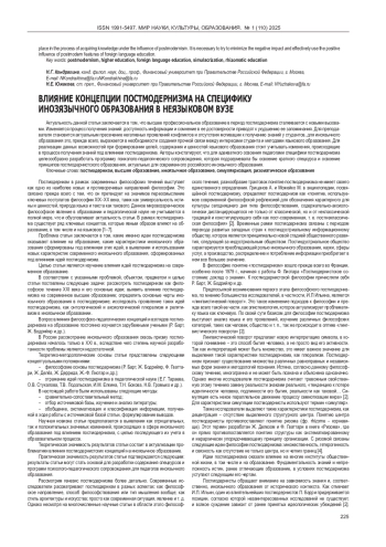 3. Ломтева Т.Н., Сальникова Н.В. Специфика реализации современных тенденций обучения иностранному языку русскоязычной аудитории в условиях культурных изменений общества постмодерна. Мир науки. Педагогика и психология. 2020; №1. Available at: https://cyberleninka.ru/article/n/spetsifika-realizatsii-sovremennyh-tendentsiy-obucheniya-inostrannomu-yazyku-russkoyazychnoy-auditorii-v-usloviyah-kulturnyh.