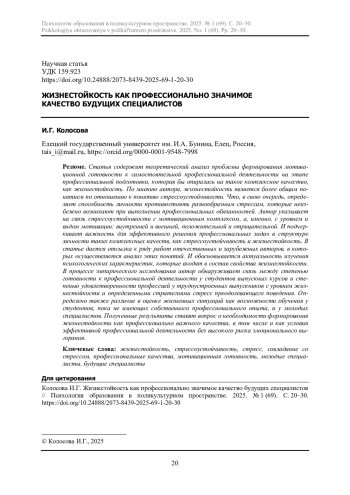 Статья содержит теоретический анализ проблемы формирования мотивационной готовности к самостоятельной профессиональной деятельности на этапе профессиональной подготовки, которая бы опиралась на такое комплексное качество, как жизнестойкость. По мнению автора, жизнестойкость является более общим понятием по отношению к понятию стрессоустойчивости. Что, в свою очередь, определяет способность личности противостоять разнообразным стрессам, которые неизбежно возникают при выполнении профессиональных обязанностей. Автор указывает на связь стрессоустойчивости с мотивационным комплексом, а, именно, с уровнем и видом мотивации: внутренней и внешней, положительной и отрицательной. И подчеркивает важность для эффективного решения профессиональных задач в структуре личности таких комплексных качеств, как стрессоустойчивость и жизнестойкость. В статье дается отсылка к ряду работ отечественных и зарубежных авторов, в которых осуществляется анализ этих понятий. И обосновывается актуальность изучения психологических характеристик, которые входят в состав свойства жизнестойкости. В процессе эмпирического исследования автор обнаруживает связь между степенью готовности к профессиональной деятельности у студентов выпускных курсов и степенью удовлетворенности профессией у трудоустроенных выпускников с уровнем жизнестойкости и определенными стратегиями стресс преодолевающего поведения. Определено также различие в оценке жизненных ситуаций как возможности обучения у студентов, пока не имеющих собственного профессионального опыта, и у молодых специалистов. Полученные результаты ставят вопрос о необходимости формирования жизнестойкости как профессионально важного качества, в том числе и как условия эффективной профессиональной деятельности без высокого риска эмоционального выгорания.