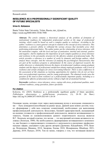 21. Церфус Д.Н. Связь жизнестойкости и стилей саморегуляции поведения курсантов МЧС России // Дошкольное и начальное образование: теория и практика. Материалы научной конференции. Ярославль: Ярославский государственный педагогический университет им. К.Д. Ушинского, 2024. С. 93-98.