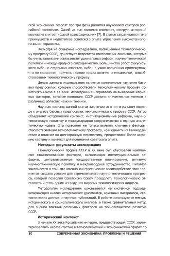 Изучение базовых предпосылок технологического прорыва СССР является актуальной темой, так как позволяет понять механизмы, которые способствовали значительным достижениям в науке и технике в условиях плановой экономики. Этот вопрос привлекает внимание исследователей, так как успехи СССР в аэрокосмической отрасли, ядерной энергетике и других высокотехнологичных областях остаются предметом изучения и обсуждения. Одним из ключевых иностранных авторов, исследовавших институциональные предпосылки технологического прорыва, является Ричард Саква. В своей книге «The Rise and Fall of the Soviet Union» он анализирует политические и экономические аспекты развития СССР, включая технологические достижения [11]. Саква подчеркивает роль централизованного планирования и концентрации ресурсов на приоритетных направлениях, что позволило СССР достичь значительных успехов в науке и технике.