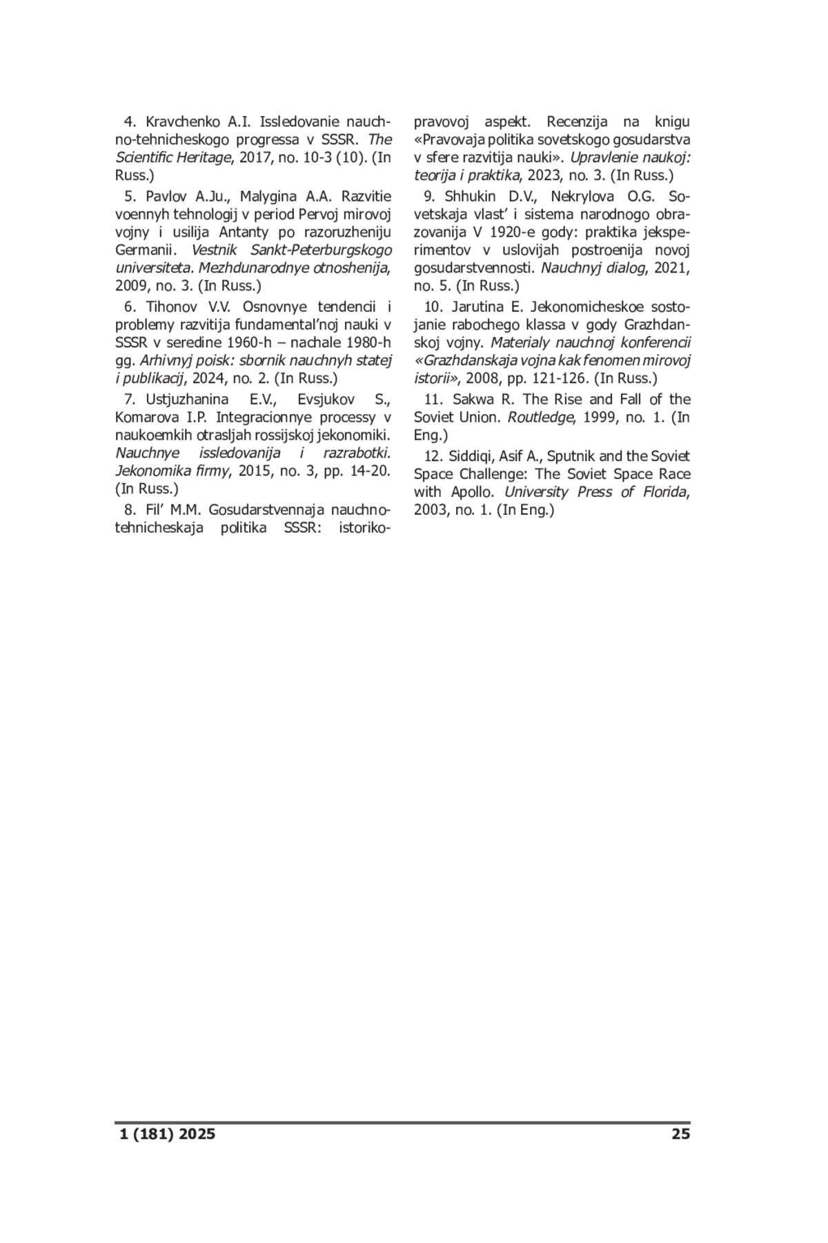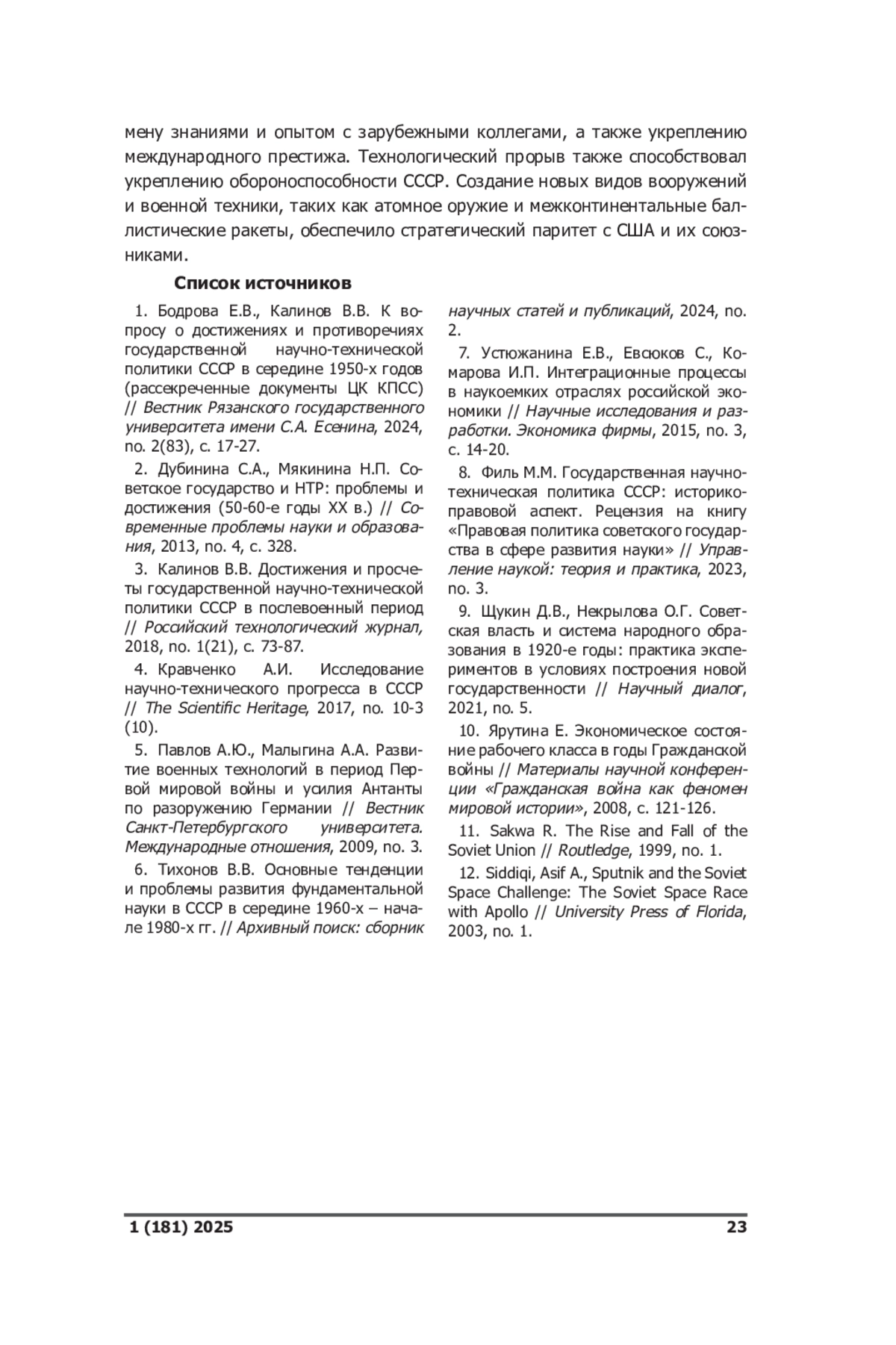 1. Бодрова Е.В., Калинов В.В. К вопросу о достижениях и противоречиях государственной научно-технической политики СССР в середине 1950-х годов (рассекреченные документы ЦК КПСС) // Вестник Рязанского государственного университета имени С.А. Есенина, 2024, no. 2(83), c. 17-27. EDN: HQXQPA