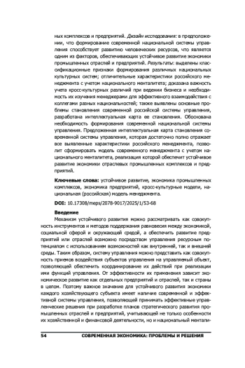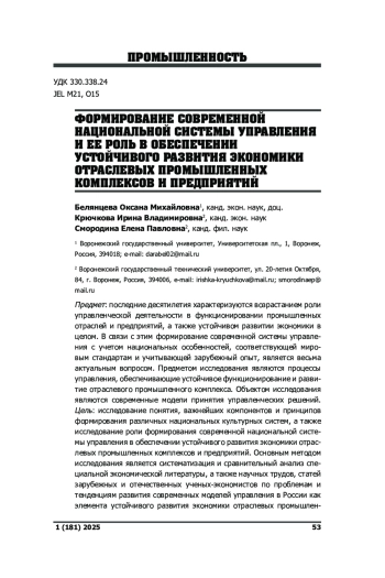 Предмет: последние десятилетия характеризуются возрастанием роли управленческой деятельности в функционировании промышленных отраслей и предприятий, а также устойчивом развитии экономики в целом. В связи с этим формирование современной системы управления с учетом национальных особенностей, соответствующей мировым стандартам и учитывающей зарубежный опыт, является весьма актуальным вопросом. Предметом исследования являются процессы управления, обеспечивающие устойчивое функционирование и развитие отраслевого промышленного комплекса. Объектом исследования являются современные модели принятия управленческих решений. Цель: исследование понятия, важнейших компонентов и принципов формирования различных национальных культурных систем, а также исследование роли формирования современной национальной системы управления в обеспечении устойчивого развития экономики отраслевых промышленных комплексов и предприятий. Основным методом исследования является систематизация и сравнительный анализ специальной экономической литературы, а также научных трудов, статей зарубежных и отечественных ученых-экономистов по проблемам и тенденциям развития современных моделей управления в России как элемента устойчивого развития экономики отраслевых промышленных комплексов и предприятий. Дизайн исследования: в предположении, что формирование современной национальной системы управления способствует развитию человеческих ресурсов, что является одним из факторов, обеспечивающих устойчивое развитие экономики промышленных отраслей и предприятий. Результаты: выделены классификационные признаки формирования различных национальных культурных систем; отличительные характеристики российского менеджмента с учетом национального менталитета; доказана важность учета кросс-культурных различий при ведении бизнеса и необходимость их изучения менеджерами для эффективного взаимодействия с коллегами разных национальностей; также выявлены основные проблемы становления современной российской системы управления, разработана интеллектуальная карта ее становления. Обоснована необходимость формирования современной национальной системы управления. Предложенная интеллектуальная карта становления современной системы управления, которая достаточно полно отражает все выявленные характеристики российского менеджмента, позволит сформировать модель современного менеджмента с учетом национального менталитета, реализация которой обеспечит устойчивое развитие экономики отраслевых промышленных комплексов и предприятий.