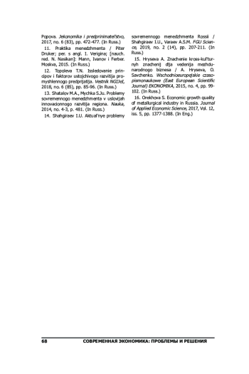 16. Orekhova S. Economic growth quality of metallurgical industry in Russia / S. Orekhova // Journal of Applied Economic Science, 2017, Vol. 12, iss. 5, рр. 13771388.