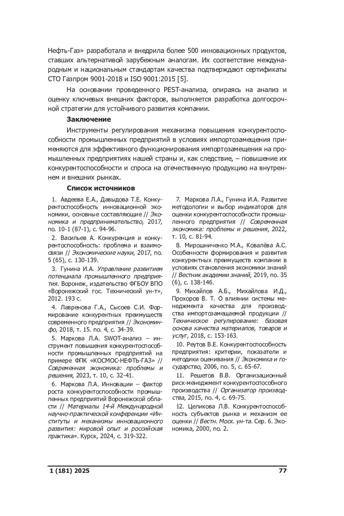 7. Маркова Л.А., Гунина И.А. Развитие методологии и выбор индикаторов для оценки конкурентоспособности промышленного предприятия // Современная экономика: проблемы и решения, 2022, т. 10, с. 81-94. EDN: MONEWX