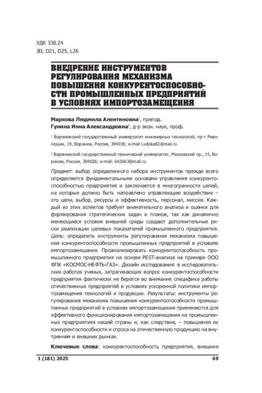 Предмет: выбор определенного набора инструментов прежде всего определяется фундаментальными основами управления конкурентоспособностью предприятия и заключается в многогранности целей, на которые должно быть направлено управляющее воздействие - это цели, выбор, ресурсы и эффективность, персонал, миссия. Каждый из этих аспектов требует внимательного анализа и оценки для формирования стратегических задач и планов, так как динамично меняющиеся условия внешней среды создают дополнительные риски реализации целевых показателей промышленного предприятия. Цель: определить инструменты регулирования механизма повышения конкурентоспособности промышленных предприятий в условиях импортозамещения. Проанализировать конкурентоспособность промышленного предприятия на основе PEST-анализа на примере ООО ФПК «КОСМОС-НЕФТЬ-ГАЗ». Дизайн исследования: в исследовательских работах ученых, затрагивающих вопрос конкурентоспособности предприятия фактически не берется во внимание специфика работы отечественных предприятий в условиях ускоренной политики импортозамещения технологий и продукции. Результаты: инструменты регулирования механизма повышения конкурентоспособности промышленных предприятий в условиях импортозамещения применяются для эффективного функционирования импортозамещения на промышленных предприятиях нашей страны и, как следствие, - повышение их конкурентоспособности и спроса на отечественную продукцию на внутреннем и внешних рынках.