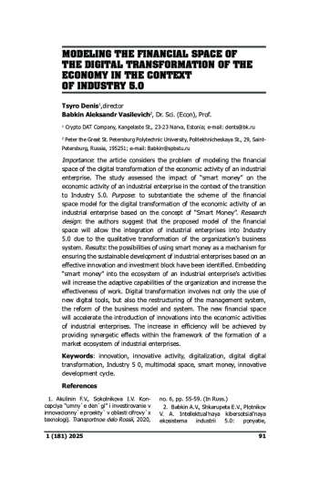 Предмет: в статье рассматривается проблема моделирования финансового пространства цифровой трансформации экономической деятельности промышленного предприятия. В ходе исследования выполнена оценка влияния «умных денег» на экономическую деятельность промышленного предприятия в условиях перехода к Индустрии 5.0. Цель: обосновать схему модели финансового пространства цифровой трансформации экономической деятельности промышленного предприятия, основанную на концепции «Умных денег». Дизайн исследования: авторы предполагают, что предложенная модель финансового пространства позволит интегрировать промышленные предприятия в Индустрию 5.0 за счет качественной трансформации бизнес-системы организации. Результаты: определены возможности использования «умных денег» как механизма, обеспечивающего устойчивое развитие промышленных предприятий на основе эффективного инновационноинвестиционного блока. Встраивание «умных денег» в экосистему деятельности промышленного предприятия позволит повысить адаптивные возможности организации, увеличит результативность работы. Цифровая трансформация предусматривает не только использование новых цифровых инструментов, но также перестройку системы управления, реформирование модели и системы бизнеса. Новое финансовое пространство позволит ускорить внедрение инноваций в экономическую деятельность промышленных предприятий. Прирост эффективности будет получен за счет обеспечения синергетических эффектов в рамках формирования рыночной экосистемы промышленных предприятий.