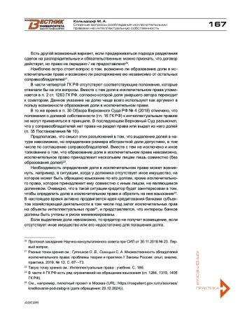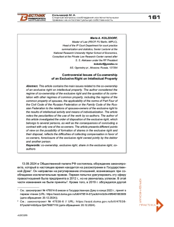 В данной статье приведен срез основных проблем, связанных с сообладанием исключительным правом на объекты интеллектуальной собственности. Автор рассмотрел режим сообладания исключительным правом и вопрос его соотношения с иными режимами общего имущества, в том числе с режимом общего имущества супругов, применимость норм части четвертой Гражданского кодекса РФ или Семейного кодекса РФ к отношениям супругов-сообладателей исключительного права на результаты интеллектуальной деятельности и средства индивидуализации. В статье отмечены особенности использования произведения соавторами. Автор исследовал порядок распоряжения исключительным правом, которое принадлежит нескольким лицам, а также последствия заключения сделок лишь одним из соправообладателей. В статье приводятся различные точки зрения на возможность образования долей в исключительном праве и распоряжения ими, отражены сложности взыскания компенсации в пользу нескольких правообладателей, обращения взыскания на исключительное право, принадлежащее совместно должнику и иному лицу.