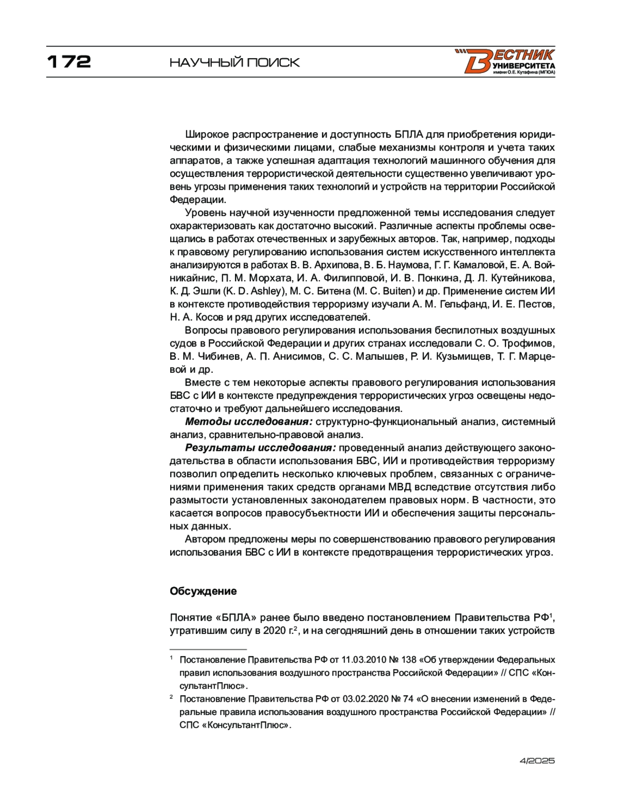 Результаты и ключевые выводы. В результате исследования нормативно-правовой базы, регулирующей вопросы использования БВС и технологий ИИ в рамках деятельности по предупреждению террористических угроз, были определены ключевые проблемы и предложены меры по совершенствованию ряда нормативных правовых актов.
