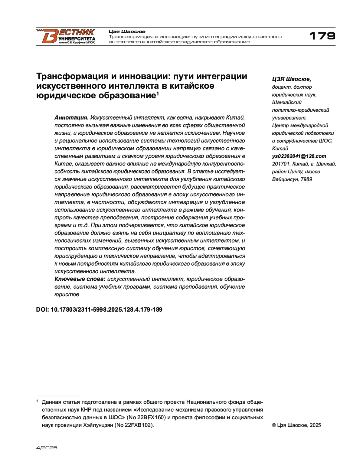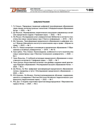 7. Чжан Вэньсянь. О глубокой интеграции юридического образования и искусственного интеллекта // Цифровое право. - 2025. - № 1.