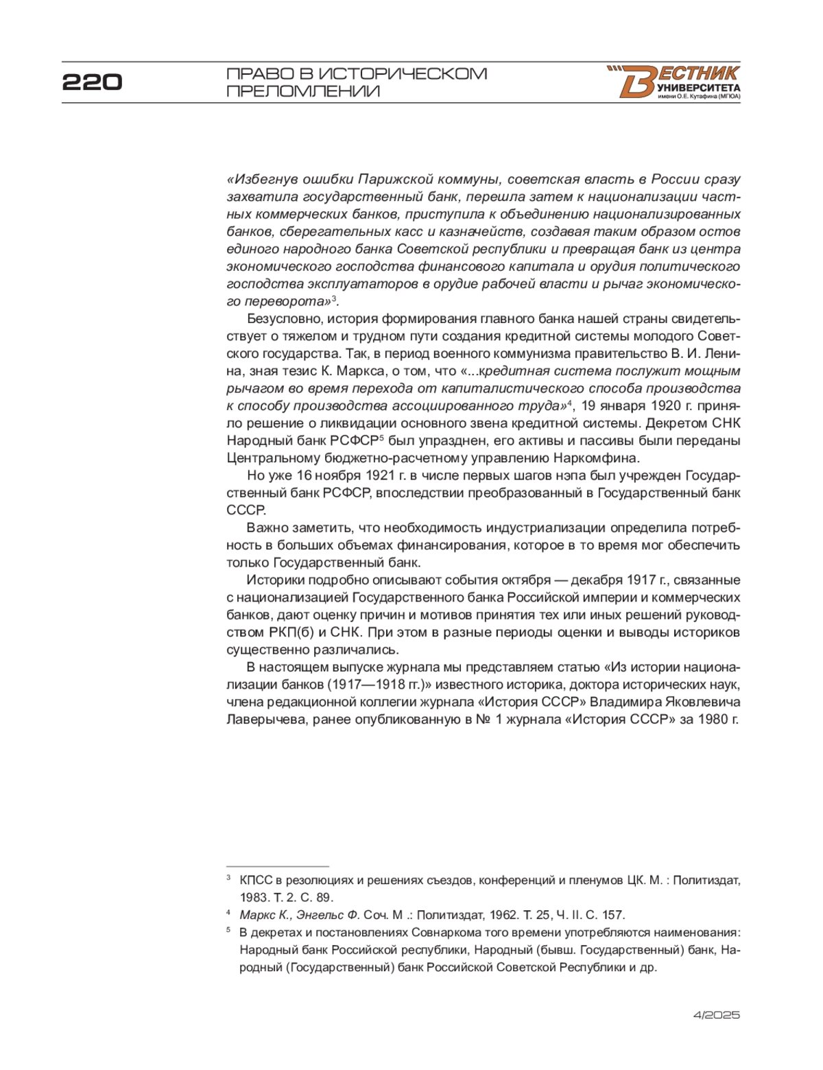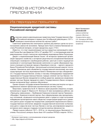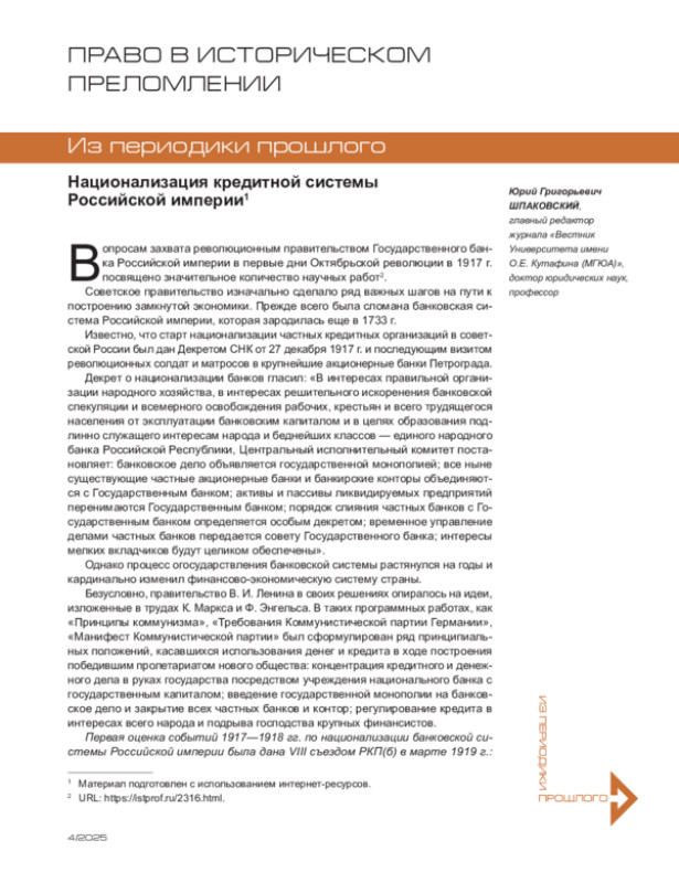 Для цитирования: Шпаковский Ю. Г. Национализация кредитной системы Российской империи. Вестник Университета имени О. Е. Кутафина (МГЮА). 2025;1(4):219-220.