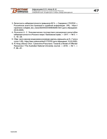 4. Линников А. С. Экономические последствия расширения масштабов киберпреступности в России и мире // Банковское право. - 2017. - № 5. - С. 19-29.