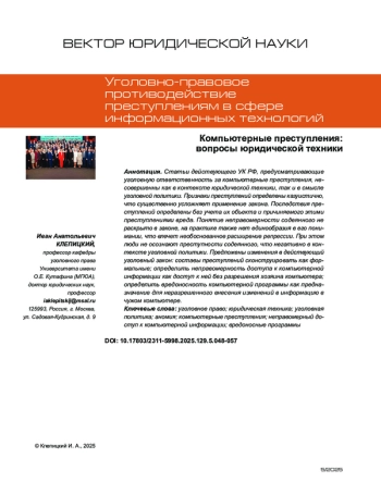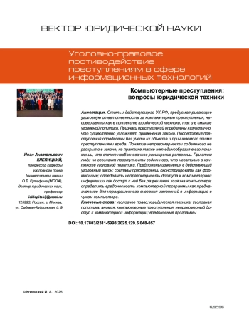 В статье рассматриваются различные аспекты технико-юридического совершенствования ст. 2721, внесенной в уголовное законодательство Федеральным законом от 30.11.2024 № 421-ФЗ. Представляется, что достаточных криминологических оснований для расширения криминализации главы о компьютерных преступлениях путем конструирования самостоятельного состава преступления не имелось. С появлением ст. 2721 УК РФ возникает конкуренция со ст. 137 УК РФ и ст. 13.11 КоАП РФ. Самостоятельная криминализация хранения персональных данных в электронной форме в качестве деяния средней тяжести не соответствует характеру и степени общественной опасности деяния. Отсутствие нормативно-правового регулирования в сфере противодействия незаконному обороту программ, предназначенных для незаконного оборота компьютерной информации, содержащей персональные данные, затрудняет возможность эффективного правоприменения, для чего необходимо внесение изменений в действующее законодательство криминального цикла и об оперативно-розыскной деятельности. Методологическая база исследования построена на диалектическом методе познания, общенаучных и частно-научных методах исследования. Автор использует системный подход к анализу проблемы, что позволяет рассмотреть ее в комплексе.