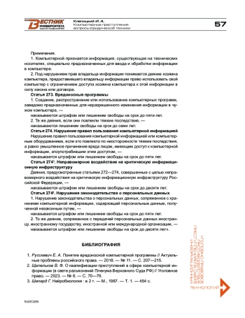 1. Русскевич Е. А. Понятие вредоносной компьютерной программы // Актуальные проблемы российского права. - 2018. - № 11. - С. 207-215.