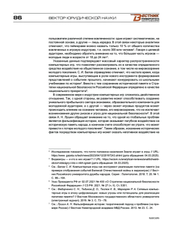 Статья посвящена уголовно-правовой оценке фальсификации истории в компьютерных играх, которые сегодня наряду с социальными сетями, интернет-порталами, видеохостингами, новостными сайтами стали дополнительной коммуникационной площадкой для обмена данными среди пользователей информационных технологий. Согласно исследованиям международных компаний, количество игроков постоянно увеличивается, охватывая разные возрастные группы и регионы, что подтверждает массовый характер игровой индустрии. Особо распространены среди молодого поколения компьютерные игры, сюжет которых связан с событиями Второй мировой войны и Великой Отечественной войны. В этой связи в статье сформулированы предложения по квалификации действий, фальсифицирующих исторические факты, содержащиеся в компьютерных играх. Обращается внимание на неопределенность правовой природы компьютерных игр, отсутствие регламентации разработки и определения содержания игровых продуктов, что порождает сложности уголовно-правовой оценки искажения информации об исторических событиях в играх.