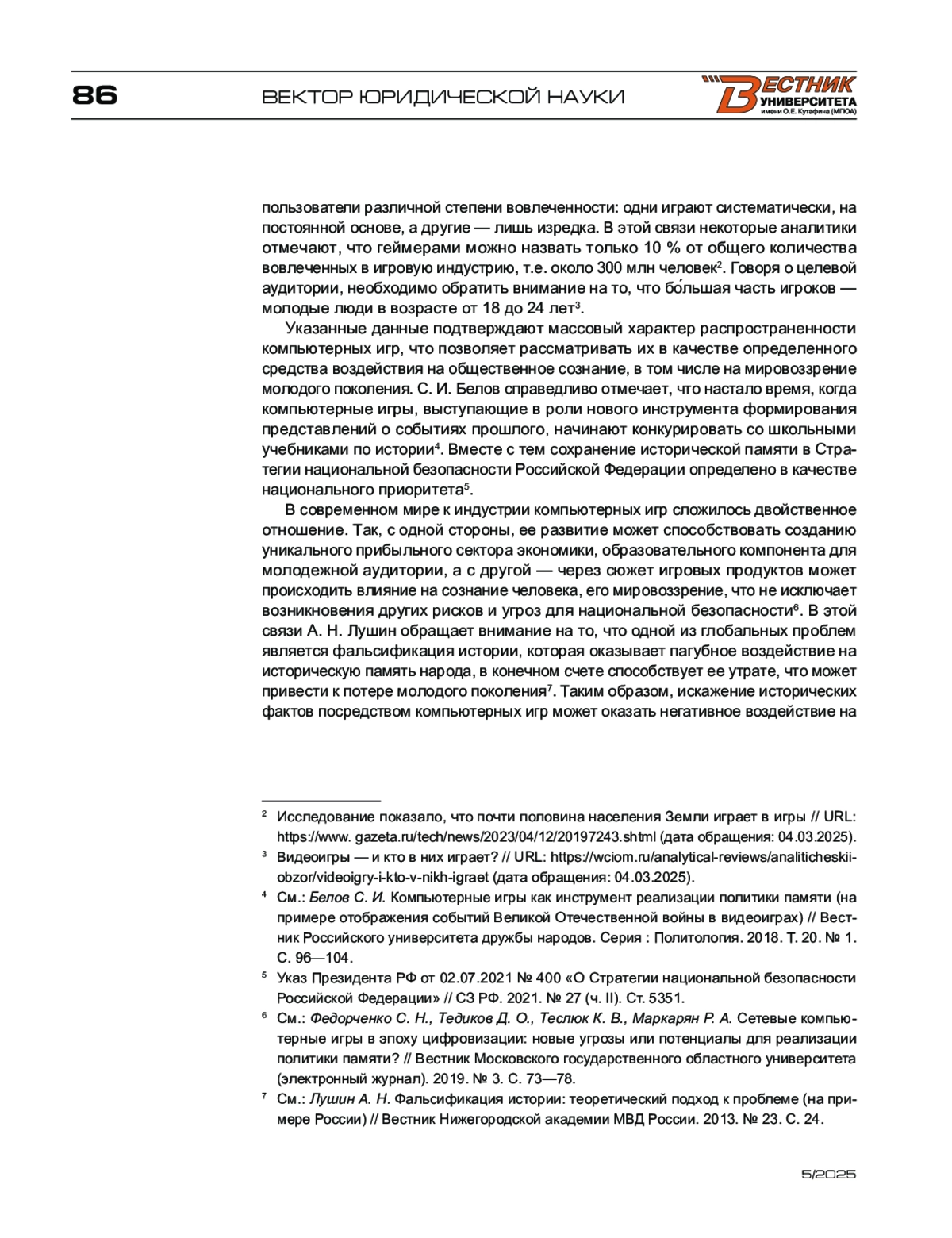 2. Белов С. И. Компьютерные игры как инструмент реализации политики памяти (на примере отображения событий Великой Отечественной войны в видеоиграх) // Вестник Российского университета дружбы народов. - Серия: Политология. - 2018. - Т. 20. - № 1. - С. 96-104.