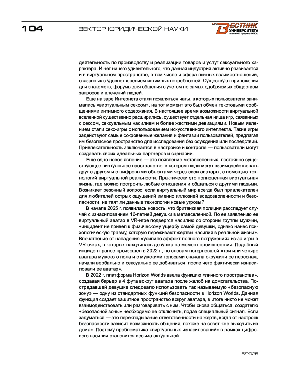 В статье рассмотрены актуальные уголовно-правовые вопросы, связанные с распространением половых преступлений с использованием метапространства и с вовлечением в занятие проституцией в информационно-телекоммуникационной сети Интернет, а также даны рекомендации по совершенствованию противодействия этим явлениям. Актуальность работы обусловлена тем, что коммерческий секс в цифровую эпоху активно трансформируется благодаря развитию технологий, таких как виртуальная реальность, метавселенные и искусственный интеллект. Эти инновации открывают новые возможности для удовлетворения интимных потребностей, но одновременно создают вызовы для правовой системы и общества. Авторы делают вывод, что правоприменитель может адаптировать существующие практики, чтобы защитить общество от новых угроз, сохраняя баланс между инновациями и безопасностью, в то же время не создавая искусственно новых составов преступления. С данными негативными проявлениями возможно бороться с помощью уже существующих норм, если внести в них дополнения с учетом процессов, появляющихся в метамире.