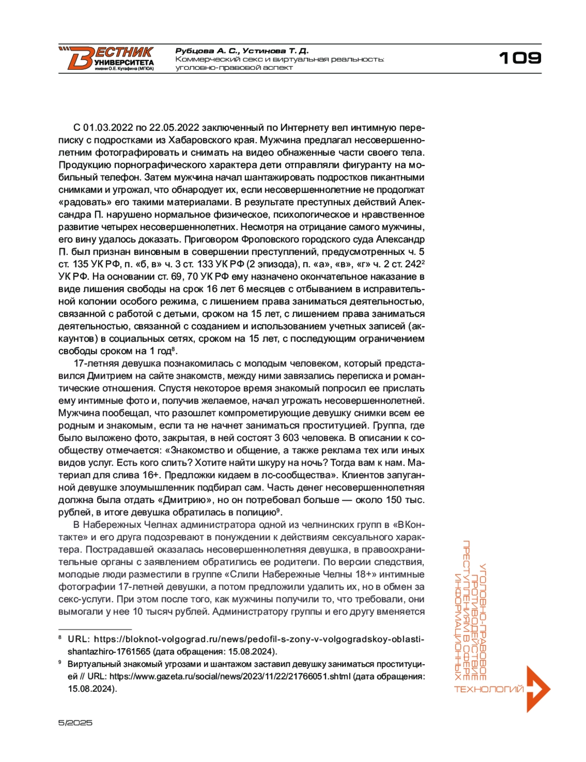 3. Виртуальный знакомый угрозами и шантажом заставил девушку заниматься проституцией // URL:https://www.gazeta.ru/social/news/2023/11/22/21766051.shtml (дата обращения: 15.08.2024).