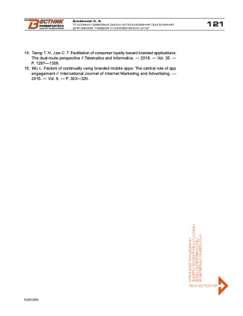 14. Tseng T. H., Lee C. T. Facilitation of consumer loyalty toward branded applications: The dual-route perspective // Telematics and Informatics. - 2018. - Vol. 35. - P. 1297-1309.