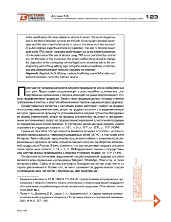 В статье рассматриваются существующие уголовно-правовые запреты в сфере оборота алкогольной продукции в Российской Федерации. Проведен анализ такого признака, как «использование информационно-телекоммуникационных сетей, включая сеть Интернет» при квалификации преступлений, связанных с оборотом алкогольной продукции. Наиболее опасными деяниями в сфере оборота алкогольной продукции является сбыт некачественной алкогольной продукции и сбыт алкогольной продукции несовершеннолетним. Именно эти деяния посягают на общественные отношения, подлежащие уголовно-правовой охране. Реализация алкогольной продукции с использованием ИТКС обладает повышенной общественной опасностью, однако в настоящее размещение информации о продаже алкоголя с использованием ИТКС не запрещено уголовным законом. На основании данного вывода автором обосновывается предложение изменить диспозицию исследуемой уголовно-правовой нормы, а также добавить в соответствующую часть квалифицирующий признак «с использованием средств массовой информации либо электронных или информационно-телекоммуникационных сетей (включая сеть Интернет)».