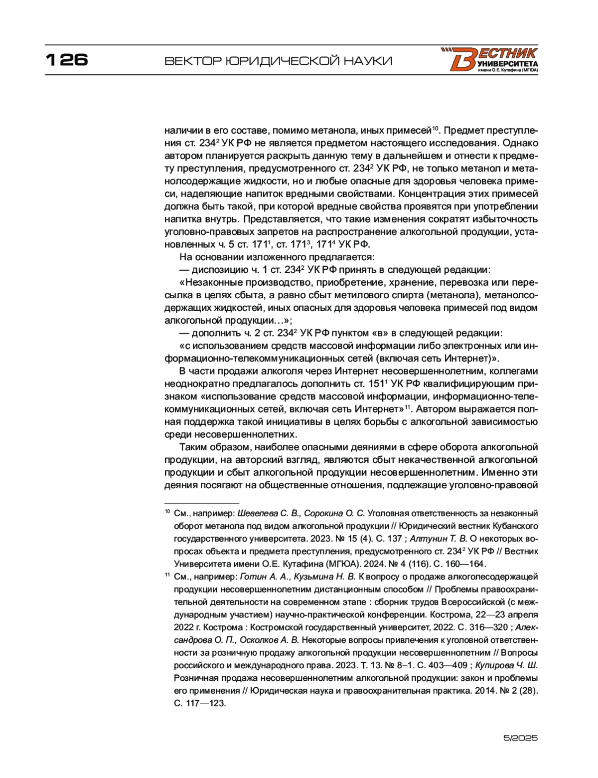 8. Шевелева С. В., Сорокина О. С. Уголовная ответственность за незаконный оборот метанола под видом алкогольной продукции // Юридический вестник Кубанского государственного университета. - 2023. - № 15 (4).