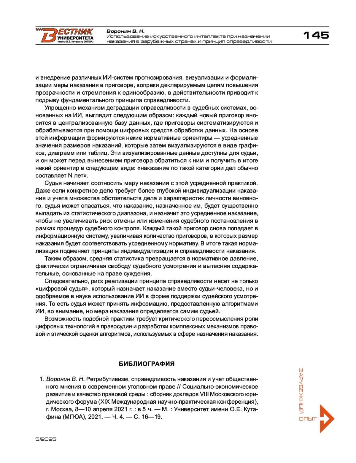1. Воронин В. Н. Ретрибутивизм, справедливость наказания и учет общественного мнения в современном уголовном праве // Социально-экономическое развитие и качество правовой среды: сборник докладов VIII Московского юридического форума (XIX Международная научно-практическая конференция), г. Москва, 8-10 апреля 2021 г.: в 5 ч. - М.: Университет имени О.Е. Кутафина (МГЮА), 2021. - Ч. 4. - С. 16-19.