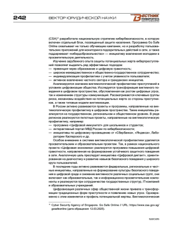 В работе приведены зарубежный и отечественный опыт реализации программ и проектов, направленных на виктимологическую профилактику в цифровом пространстве, так как международный опыт представляет ценность для формирования эффективной системы виктимологической профилактики в России и может служить основой для сравнительно-правового анализа.