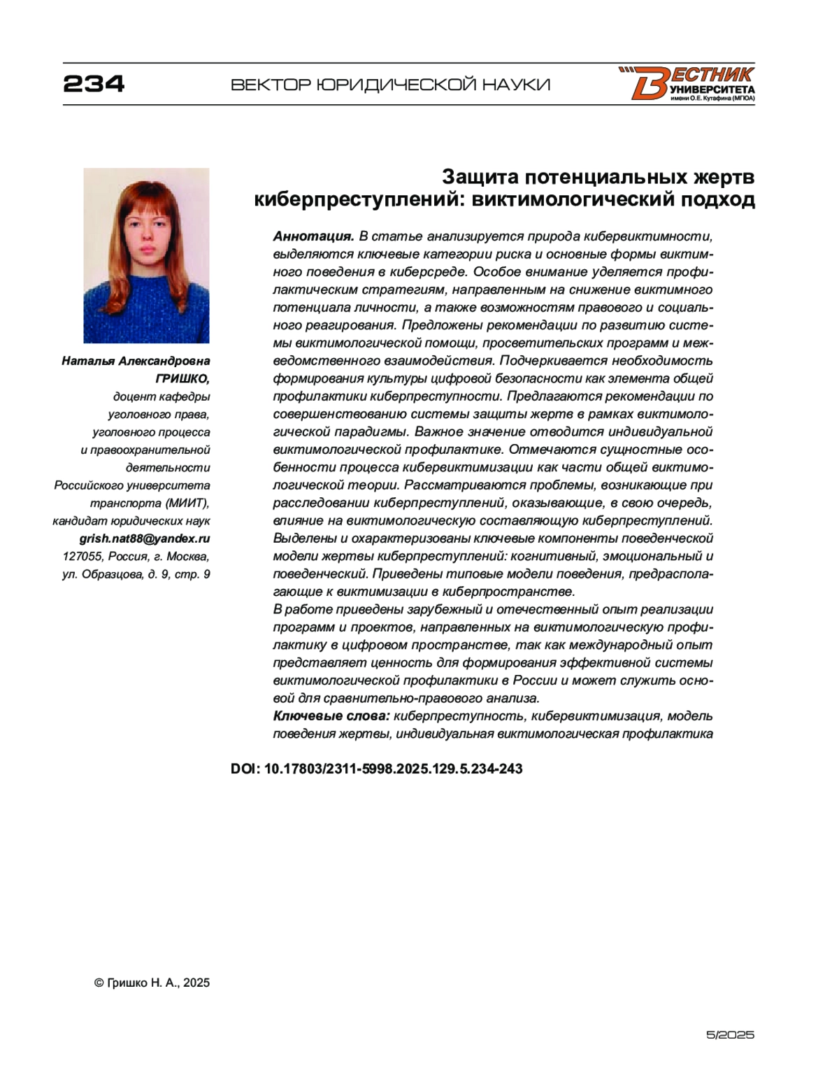 В статье анализируется природа кибервиктимности, выделяются ключевые категории риска и основные формы виктимного поведения в киберсреде. Особое внимание уделяется профилактическим стратегиям, направленным на снижение виктимного потенциала личности, а также возможностям правового и социального реагирования. Предложены рекомендации по развитию системы виктимологической помощи, просветительских программ и межведомственного взаимодействия. Подчеркивается необходимость формирования культуры цифровой безопасности как элемента общей профилактики киберпреступности. Предлагаются рекомендации по совершенствованию системы защиты жертв в рамках виктимологической парадигмы. Важное значение отводится индивидуальной виктимологической профилактике. Отмечаются сущностные особенности процесса кибервиктимизации как части общей виктимологической теории. Рассматриваются проблемы, возникающие при расследовании киберпреступлений, оказывающие, в свою очередь, влияние на виктимологическую составляющую киберпреступлений. Выделены и охарактеризованы ключевые компоненты поведенческой модели жертвы киберпреступлений: когнитивный, эмоциональный и поведенческий. Приведены типовые модели поведения, предрасполагающие к виктимизации в киберпространстве.