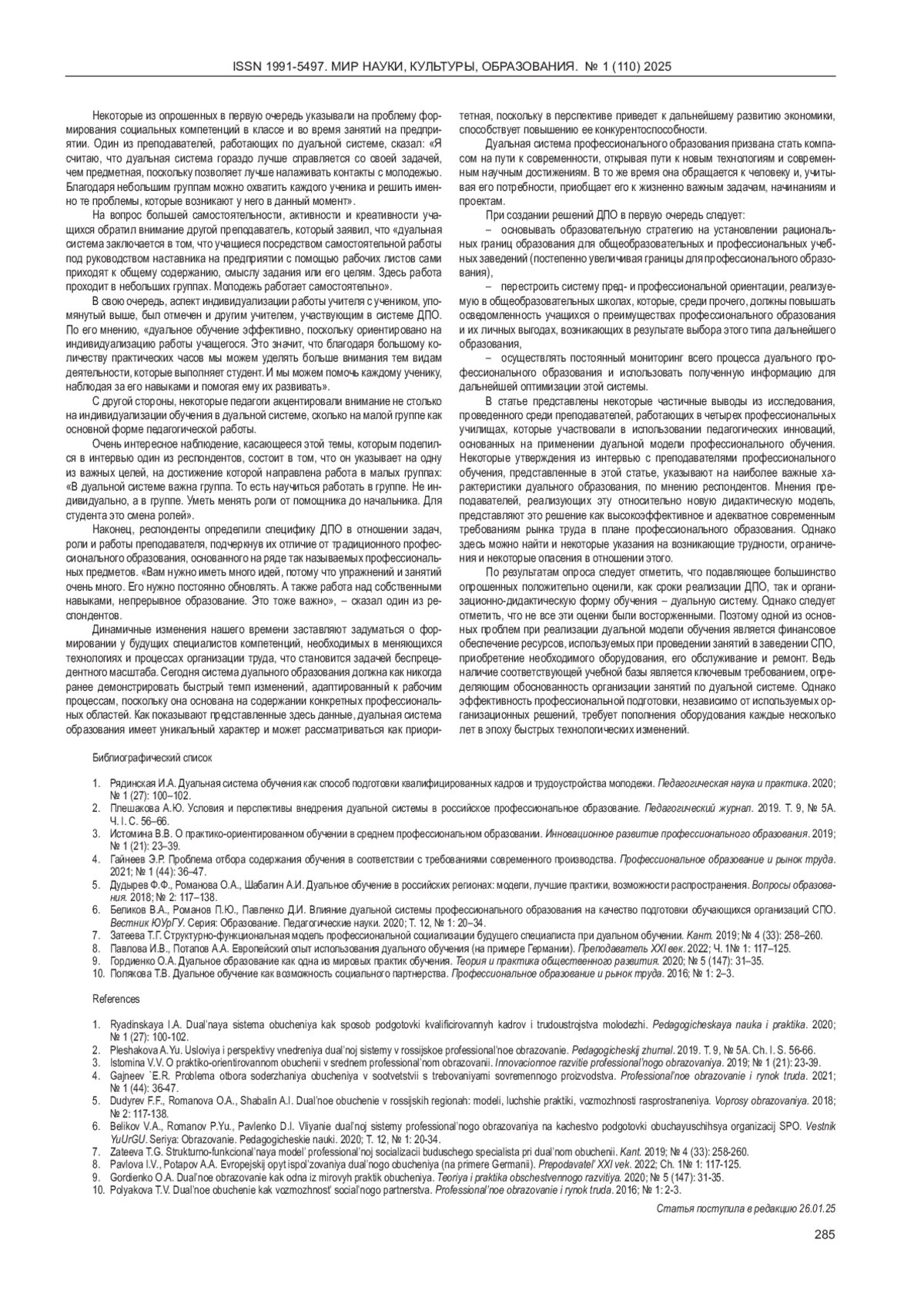 1. Рядинская И.А. Дуальная система обучения как способ подготовки квалифицированных кадров и трудоустройства молодежи. Педагогическая наука и практика. 2020; № 1 (27): 100-102. EDN: ZMPBBI