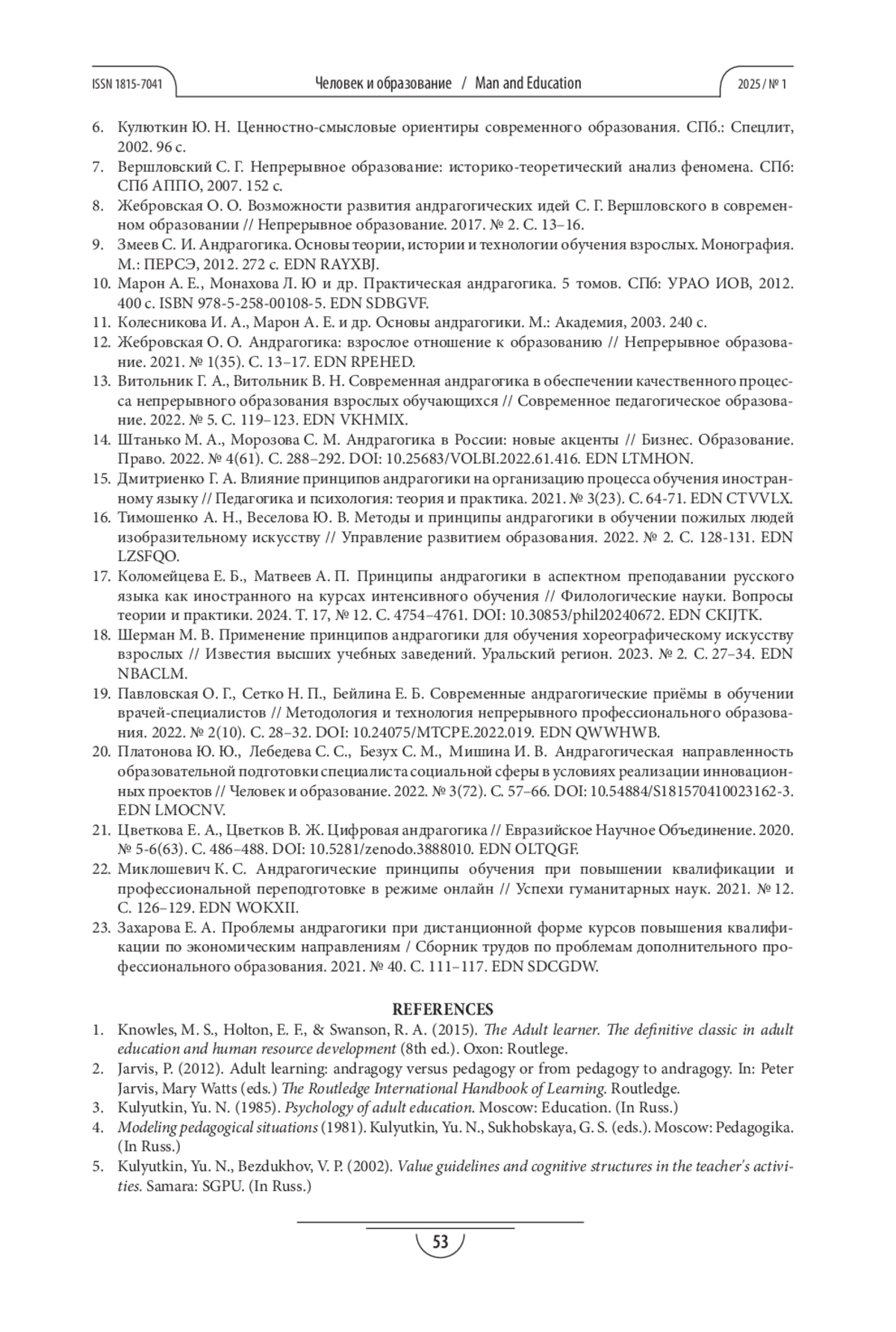13. Витольник Г. А., Витольник В. Н. Современная андрагогика в обеспечении качественного процесса непрерывного образования взрослых обучающихся // Современное педагогическое образование. 2022. № 5. С. 119-123. EDN: VKHMIX.