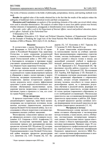 Введение: в статье раскрываются дидактические возможности использования текстов исторических документов на занятиях в ведомственном вузе в воспитательных целях. Материалы и методы: в основе проведенного исследования - диалектический метод познания действительности; применялись общенаучные и частнонаучные методы (опрос, логический, формально-юридический, системно-структурный анализ). Использовались труды известных ученых в области философии, юриспруденции, истории, методики преподавания. Результаты исследования: прикладная ценность полученных результатов состоит в том, что итоги проведенного анализа снижают неоднозначность традиционных взглядов на исторические события и их последствия. Обсуждение и заключение: анализ морализующих элементов приказа призван выявить, какие ценности использовались для стимулирования решимости. Анализ приказов помогает оценить, как формировалось общественное мнение, были ли включены в приказы элементы манипуляции, пропаганды или дезинформации.