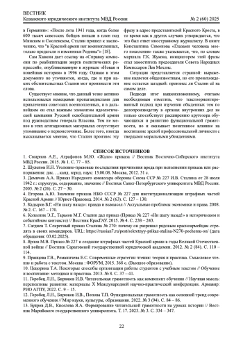 8. Ярлов М.В. Приказ № 227 и создание штрафных частей Красной армии в годы Великой Отечественной войны // Вестник Саратовской государственной юридической академии. 2012. № 2 (84). С. 110 - 114. EDN: PCFRCN