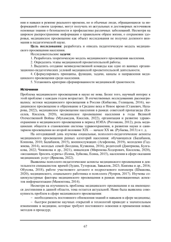 Современное российское общество сталкивается с множеством новых вызовов в области здравоохранения, таких как появление новых заболеваний, увеличение продолжительности жизни и рост числа хронических заболеваний. Все это требует нового подхода к формированию медицинской грамотности населения. Большой объем информации о здоровье и медицине определяет значимость важно обучения населения критическому мышлению и способности отличать достоверную информацию от недостоверной. Задачи по формированию у населения ответственного отношения к своему здоровью и здоровью окружающих, привитию навыков здорового образа жизни, развитию культуры здоровья приводят к необходимости поиска эффективных способов их достижения, одним из которых, по мнению авторов, является медицинское просвещение. Методология, методы и методики исследования базировались на системных и кластерных подходах как ключевых, основополагающих подходов медицинского просвещения в российском современном обществе. В работе представлена авторская педагогическая модель медицинского просвещения населения, включающая целевой, содержательный и результативный блоки. В целевом блоке модели определены цели, подходы и принципы в соответствии с базовым понятием. Дается описание функций, задач, каналов и направлений медицинского просвещения, которые были размещены в содержательном блоке модели. Исследователями выделены и описаны критерии и уровни сформированности медицинской грамотности населения. В модели также представлены этапы просветительской работы с населением и организационно-педагогические условия. Разработанная педагогическая модель медицинского просвещения населения может быть реализована как в практике подготовки специалистов медицинской сферы к медицинской просветительской деятельности, так в рамках совершенствуя профессиональных компетенций специалистов социального и гуманитарного профиля профессиональной деятельности.