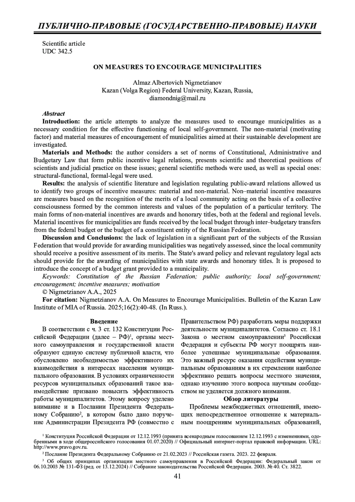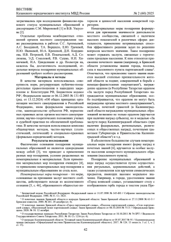 3. Нигметзянов А.А. Поощрение муниципальных образований: понятие и сущность // Актуальные проблемы российского права. 2024. Т. 19, № 8 (165). С. 46 - 56. DOI: 10.17803/1994-1471.2024.165.8.046-056 EDN: VFASFR