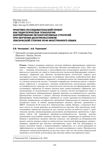 Статья посвящена вопросам изучения проблемы формирования метакогнитивных стратегий у десятиклассников при обучении иностранному языку. Цель статьи - показать возможность и целесообразность использования практико-исследовательского проекта как одной из педагогических технологий формирования метакогнитивных стратегий при обучении десятиклассников лексической стороне речи иностранного языка. Актуальность исследования обусловлена необходимостью формирования метакогнитивных стратегий у десятиклассников для оптимизации процесса усвоения иноязычной лексики. Учитывая потребность десятиклассников к планированию, рефлексии и самоанализу, показана необходимость использования практико-исследовательского проекта как педагогической технологии для формирования метакогнитивных стратегий. В статье описаны виды метакогнитивных стратегий, проанализировано их положительное влияние на усвоение лексики иностранного языка, а также предложен адаптированный вариант практико-исследовательского проекта. Предлагается включение в процесс обучения десятиклассников иностранному языку формирование метакогнитивных стратегий на основе практико-исследовательского проекта, направленного на рефлексию собственной деятельности по усвоению лексики английского языка. В статье проанализировано опытное обучение, проведенное в МБОУ «Гимназия № 64 имени В. А. Котельникова» города Липецка с учащимися десятого класса на основе практико-исследовательского проекта «Как применение метакогнитивных стратегий повлияет на мое усвоение лексики английского языка?»: представлена анкета, проанализированы результаты анкетирования, предложены 5 вариантов кейсов для проведения практико-исследовательского проекта, описаны организация и результаты опытного обучения. Анализ литературы по проблеме исследования и проведенное опытное обучение показали, что практико-исследовательский проект может являться одной из педагогических технологий формирования метакогнитивных стратегий при обучении иностранному языку, так как обучающиеся не только получают знания о метакогнитивных стратегиях, но и могут проверить их эффективность на практике в процессе изучения иностранного языка. Практические материалы статьи представлены на русском языке, так как они носят универсальный характер и могут быть использованы при обучении любому иностранному языку.