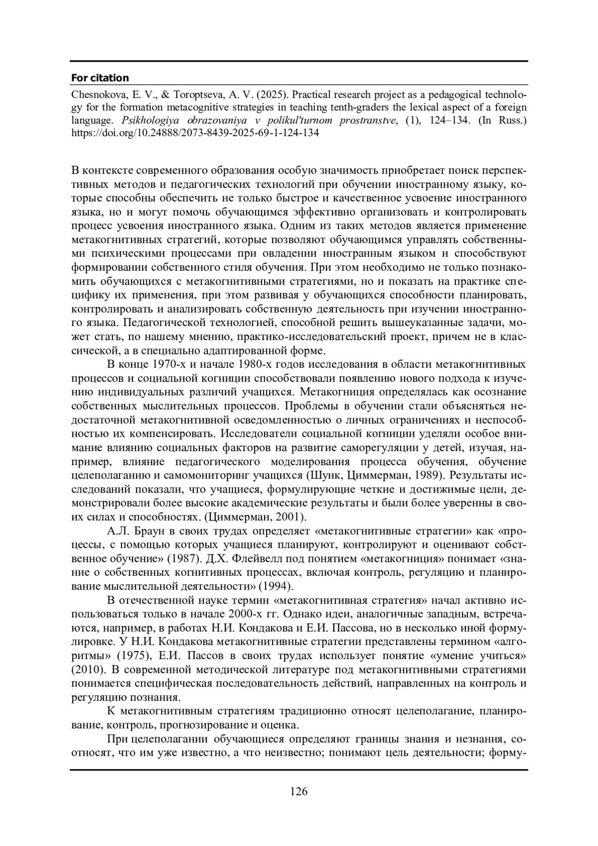 В контексте современного образования особую значимость приобретает поиск перспективных методов и педагогических технологий при обучении иностранному языку, ко-торые способны обеспечить не только быстрое и качественное усвоение иностранного языка, но и могут помочь обучающимся эффективно организовать и контролировать процесс усвоения иностранного языка. Одним из таких методов является применение метакогнитивных стратегий, которые позволяют обучающимся управлять собственными психическими процессами при овладении иностранным языком и способствуют формировании собственного стиля обучения. При этом необходимо не только познакомить обучающихся с метакогнитивными стратегиями, но и показать на практике специфику их применения, при этом развивая у обучающихся способности планировать, контролировать и анализировать собственную деятельность при изучении иностранного языка. Педагогической технологией, способной решить вышеуказанные задачи, может стать, по нашему мнению, практико-исследовательский проект, причем не в классической, а в специально адаптированной форме.
