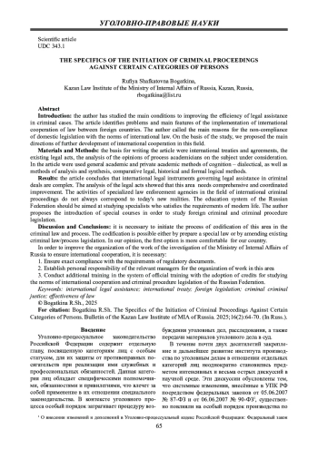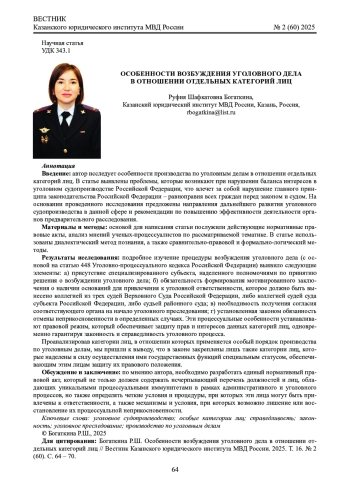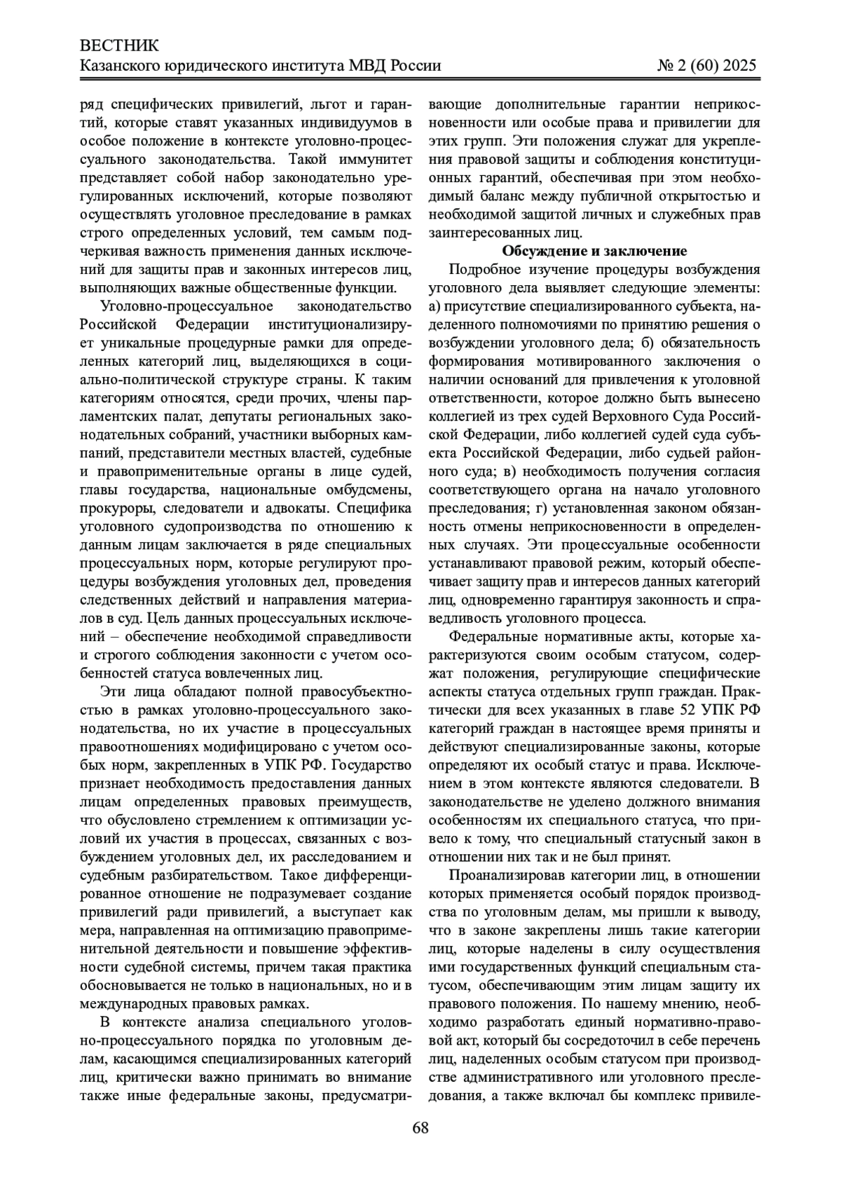 Результаты исследования: подробное изучение процедуры возбуждения уголовного дела (с основой на статью 448 Уголовно-процессуального кодекса Российской Федерации) выявило следующие элементы: а) присутствие специализированного субъекта, наделенного полномочиями по принятию решения о возбуждении уголовного дела; б) обязательность формирования мотивированного заключения о наличии оснований для привлечения к уголовной ответственности, которое должно быть вынесено коллегией из трех судей Верховного Суда Российской Федерации, либо коллегией судей суда субъекта Российской Федерации, либо судьей районного суда; в) необходимость получения согласия соответствующего органа на начало уголовного преследования; г) установленная законом обязанность отмены неприкосновенности в определенных случаях. Эти процессуальные особенности устанавливают правовой режим, который обеспечивает защиту прав и интересов данных категорий лиц, одновременно гарантируя законность и справедливость уголовного процесса. Проанализировав категории лиц, в отношении которых применяется особый порядок производства по уголовным делам, мы пришли к выводу, что в законе закреплены лишь такие категории лиц, которые наделены в силу осуществления ими государственных функций специальным статусом, обеспечивающим этим лицам защиту их правового положения.