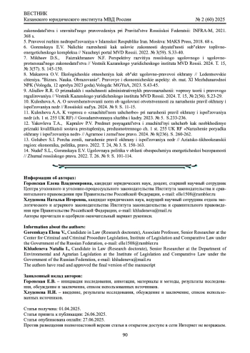 8. Макарова О.В. Экологические отношения как объект уголовно-правовой охраны // Леденцовские чтения. “Бизнес. Наука. Образование”. Правовые и экономические аспекты: сб. мат. XI Международной НПК (Вологда, 12 апреля 2023 года). Вологда: МГЮА, 2023. С.43 - 45. EDN: TBHHZW