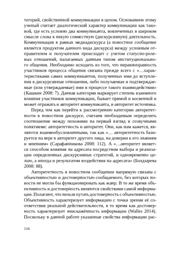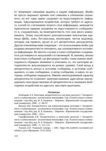 3. Сарафанникова Е.В. Авторитетность в новостном дискусре // Авторитетность и коммуникация: коллективная монография. Сер. Аспекты языка и коммуникации / под общ. ред. В. Б. Кашкина. - Воронеж: Воронежский государственный университет, 2008. - С. 111-122.