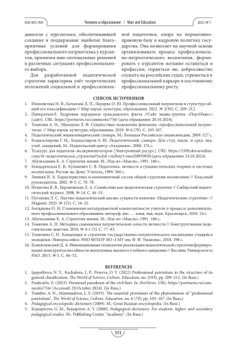 1. Ипполитова Н. В., Качалова Л. П., Перерва О. Ю. Профессиональный патриотизм в структуре общей его классификации // Мир науки, культуры, образования. 2022. № 2(93). С. 209-212.