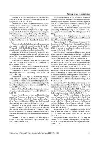7. Воронежская школа административного права: четверть века научного поиска / под ред. Ю. Н. Старилова. Воронеж: Издательский дом ВГУ,2023. 704 с. (Юбилеи, конференции, форумы; вып. 15).