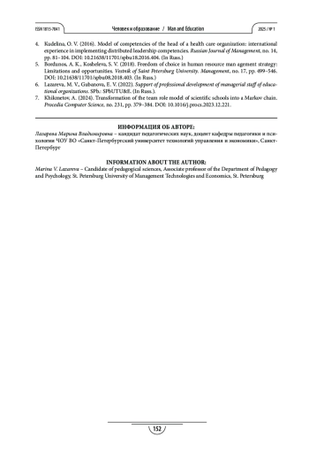 6. Лазарева М. В., Губанова Е. В. Сопровождение профессионального развития управленческих кадров образовательных организаций. СПб.: Изд-во СПбУТУиЭ, 2022. 234 с.