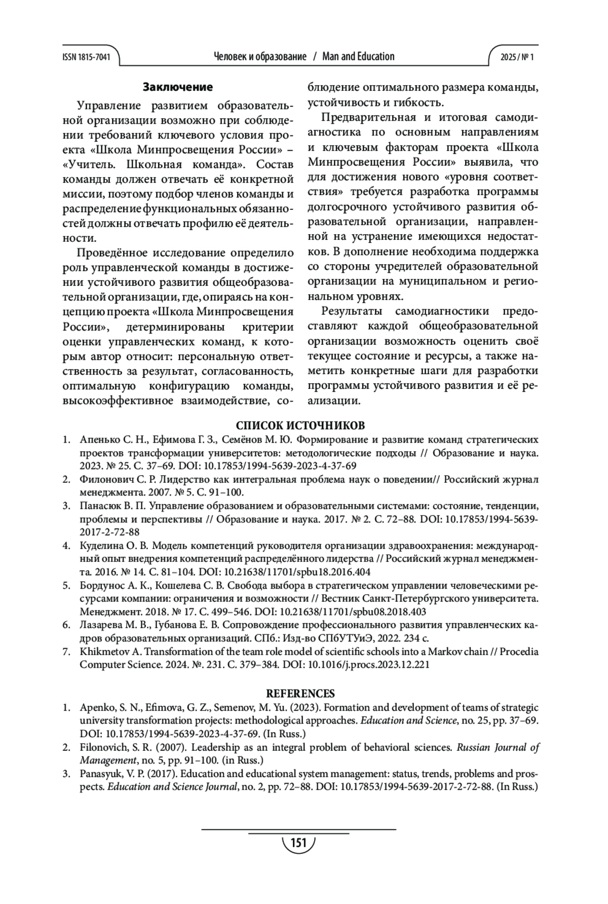 1. Апенько С. Н., Ефимова Г. З., Семёнов М. Ю. Формирование и развитие команд стратегических проектов трансформации университетов: методологические подходы // Образование и наука. 2023. № 25. С. 37-69. https://doi.org/10.17853/1994-5639-2023-4-37-69