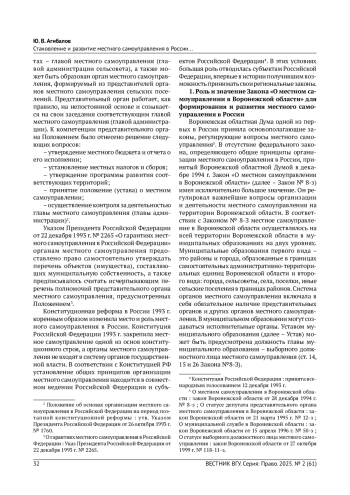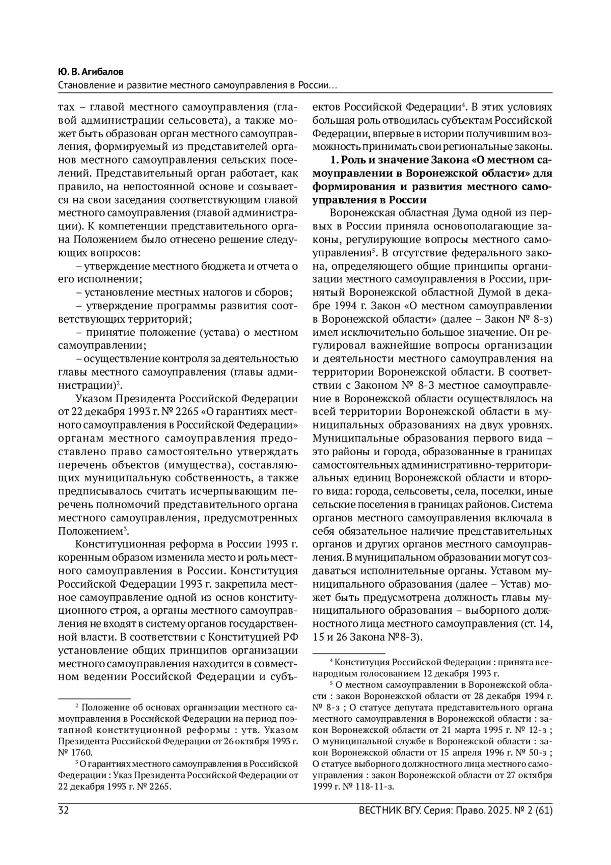 2. Агибалов Ю. В. Становление и развитие института главы муниципального образования в России: теоретические и правовые основы // Вестник Воронеж. гос. ун-та. Серия: Право. 2022. № 4. С. 353-365.