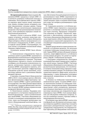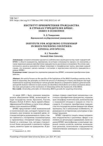 Основное внимание уделяется особенностям законодательства стран-учредителей БРИКС в области гражданства, принципам, на которых основывается процесс его получения, а также правовым рамкам приобретения гражданства по различным основаниям. На основе сравнительного анализа выявляются общие тенденции и специфические черты, присущие каждой стране, что позволяет сделать выводы о состоянии и перспективах института гражданства в рамках БРИКС.