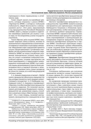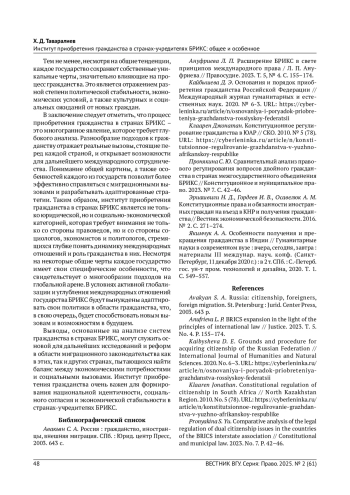 5. Пронякина С. Ю. Сравнительный анализ правового регулирования вопросов двойного гражданства в странах межгосударственного объединения БРИКС // Конституционное и муниципальное право. 2023. № 7. С. 42-46. EDN: QNBWKE