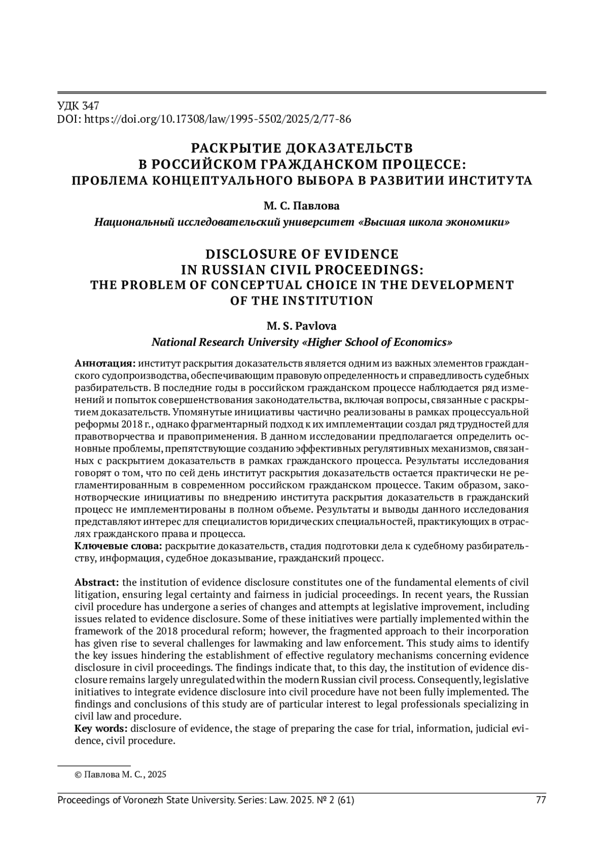 Институт раскрытия доказательств является одним из важных элементов гражданского судопроизводства, обеспечивающим правовую определенность и справедливость судебных разбирательств. В последние годы в российском гражданском процессе наблюдается ряд изменений и попыток совершенствования законодательства, включая вопросы, связанные с раскрытием доказательств. Упомянутые инициативы частично реализованы в рамках процессуальной реформы 2018 г., однако фрагментарный подход к их имплементации создал ряд трудностей для правотворчества и правоприменения. В данном исследовании предполагается определить основные проблемы, препятствующие созданию эффективных регулятивных механизмов, связанных с раскрытием доказательств в рамках гражданского процесса. Результаты исследования говорят о том, что по сей день институт раскрытия доказательств остается практически не регламентированным в современном российском гражданском процессе. Таким образом, законотворческие инициативы по внедрению института раскрытия доказательств в гражданский процесс не имплементированы в полном объеме. Результаты и выводы данного исследования представляют интерес для специалистов юридических специальностей, практикующих в отраслях гражданского права и процесса.