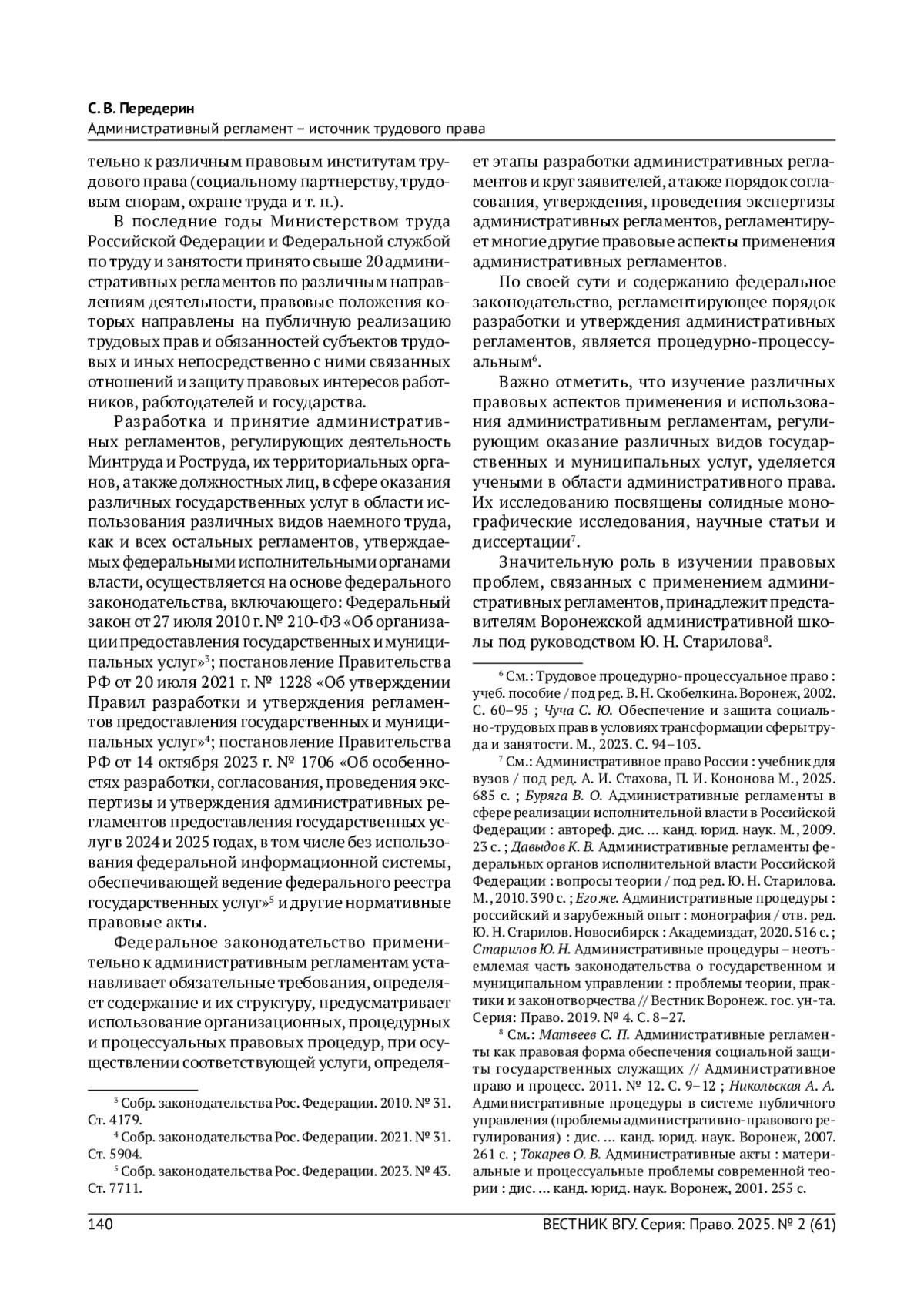 Разработка и принятие административных регламентов, регулирующих деятельность Минтруда и Роструда, их территориальных органов, а также должностных лиц, в сфере оказания различных государственных услуг в области использования различных видов наемного труда, как и всех остальных регламентов, утверждаемых федеральными и исполнительными органами власти, осуществляется на основе федерального законодательства, включающего: Федеральный закон от 27 июля 2010 г. № 210-ФЗ «Об организации предоставления государственных и муниципальных услуг»3; постановление Правительства РФ от 20 июля 2021 г. № 1228 «Об утверждении Правил разработки и утверждения регламентов предоставления государственных и муниципальных услуг»4; постановление Правительства РФ от 14 октября 2023 г. № 1706 «Об особенностях разработки, согласования, проведения экспертизы и утверждения административных регламентов предоставления государственных услуг в 2024 и 2025 годах, в том числе без использования федеральной информационной системы, обеспечивающей ведение федерального реестра государственных услуг»5 и другие нормативные правовые акты.